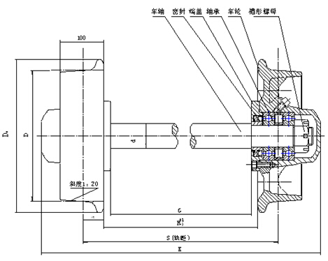 端蓋和密封架與輪殼和車軸之間采用骨架式橡膠密封圈和O型密封圈復(fù)合密封,適用于煤礦或其它類型的礦山井下或地面窄軌運(yùn)輸車輛的輪對(duì),主要由輪殼、端蓋、O型密封圈、骨架式橡膠密封圈、軸承、密封架、車軸和槽型螺母等部件組成。