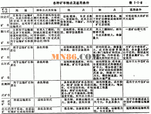 各種礦車的特點(diǎn)及適用條件見表1-1-8。