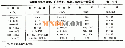 階段運(yùn)輸量與礦車容積的一般關(guān)系見表1-1-3。